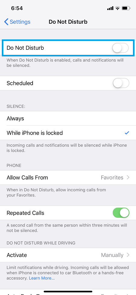Tap Do Not Disturb. 2 of 19 steps Press Do Not Disturb. Youll know Do Not Disturb is off when the switch is gray.